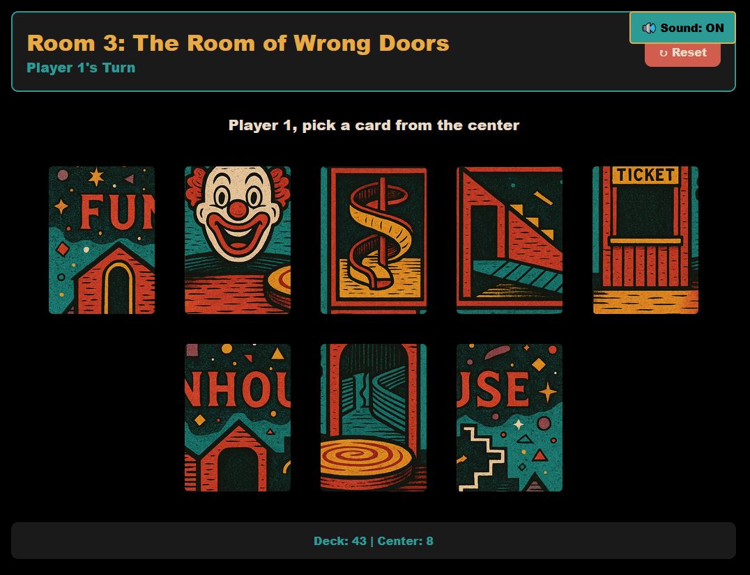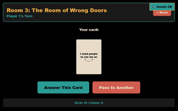 Room 3 — The Room of Wrong Doors: Pick from the center. Answer it yourself or pass it to another player.