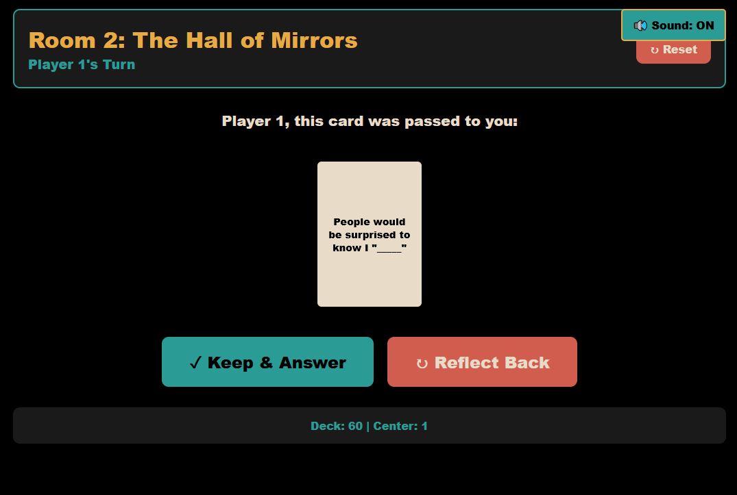 Room 2 — The Hall of Mirrors: Look at the card passed to you. Keep & answer it, or reflect it back and draw a new one.