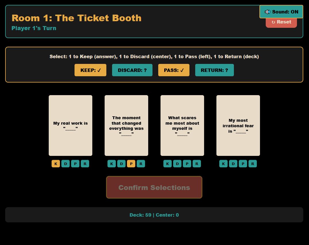 Room 1 — The Ticket Booth: Draw 4. Keep 1 to answer, discard 1 to center, pass 1 left, return 1 to the deck.