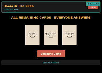 Room 4 — The Slide (Gravity): All remaining cards flip. Everyone answers every card. Together.