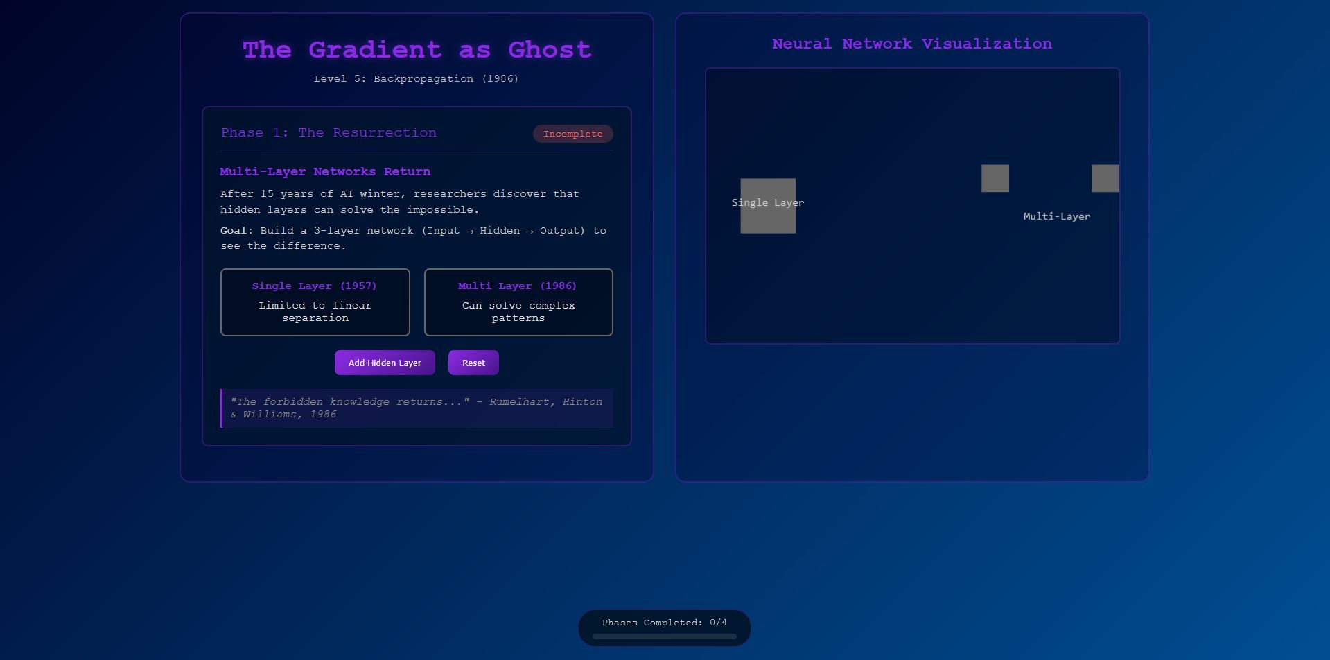 A guided micro-lesson on the breakthrough that resurrected neural nets. Add a hidden layer, follow the gradient downhill, and watch a network finally solve XOR—the problem that froze AI for 15 years. Four short phases; one big idea: learning by sending credit (and blame) backward.