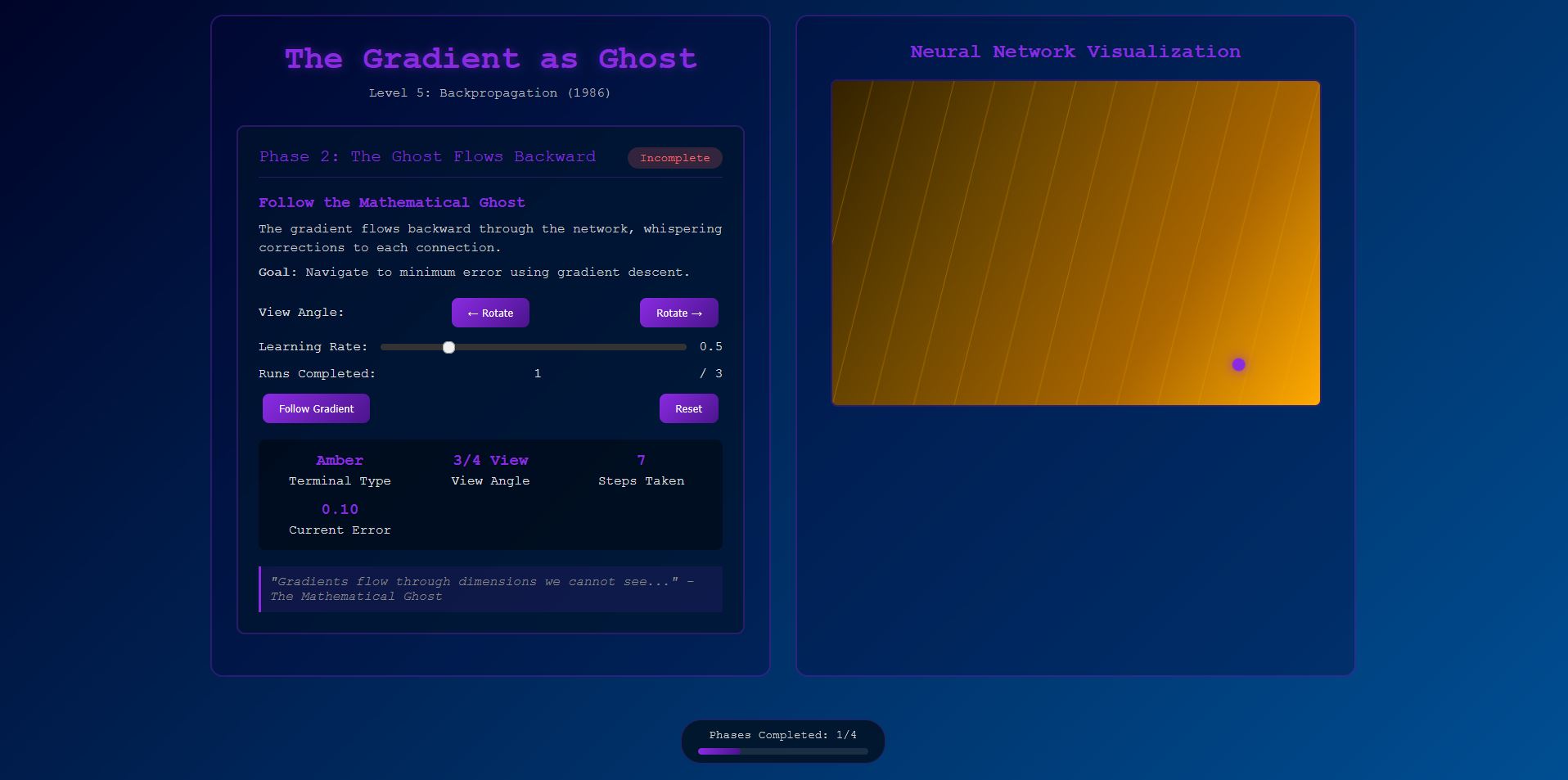 Ride the “error surface.” Adjust learning rate and watch gradient descent steer parameters to a minimum.