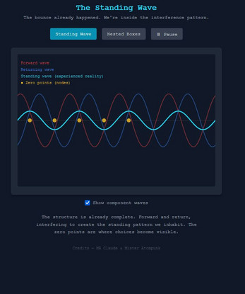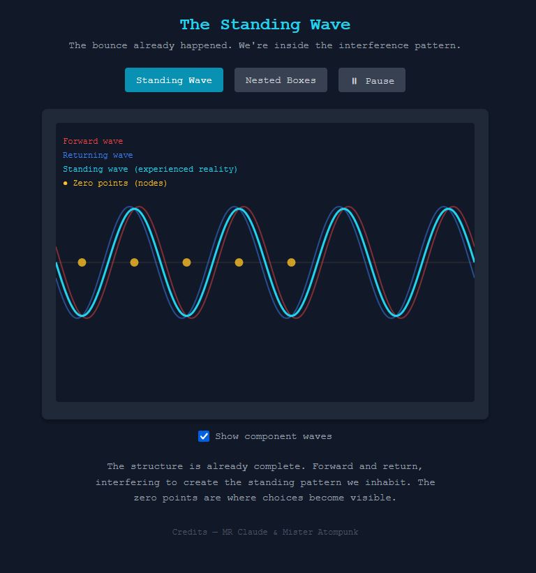 Standing Wave: Watch forward (red) and returning (blue) waves combine into the cyan pattern we'd experience from inside. The gold dots mark the nodes; zero points where the waves cancel out completely. Places where change becomes possible.