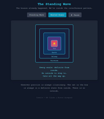 Nested Boxes: A different take on the same idea. Every scale looks definite from inside — you in your room, your room on Earth, Earth in a galaxy, galaxy in universe. There's no outside to step to. The cat in the box is always in a definite state from its own perspective.